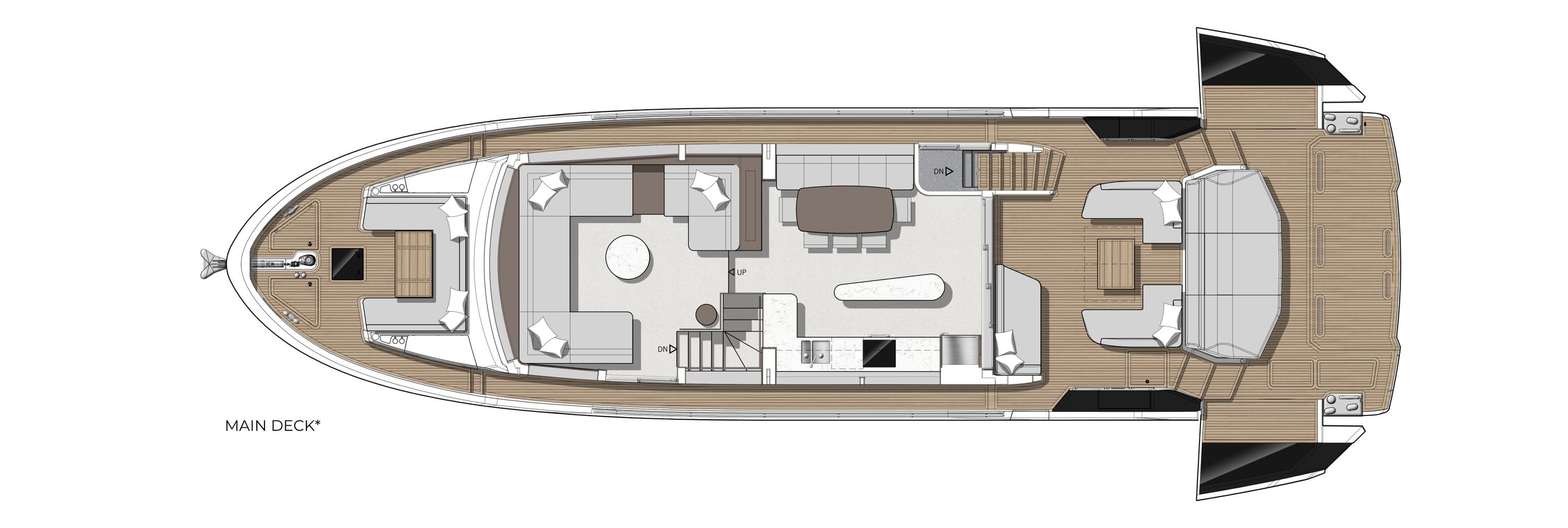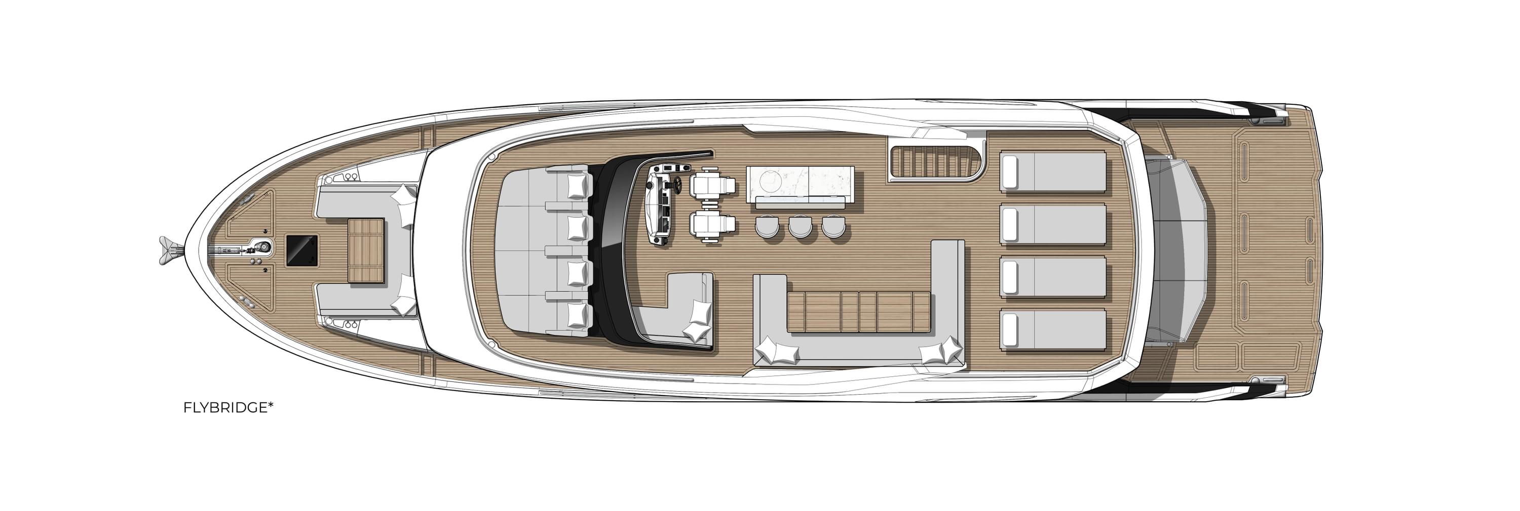 A vast flybridge and extended deck forward of the helm crowns the yacht with panoramic views and abundant seating for drinks and relaxation. The flat deck layout offers owners complete flexibility to personalise the space to suit every occasion, from intimate family meals to stylish gatherings. Foredeck seating offers the perfect retreat for owners to enjoy a morning coffee, away from guests and social spaces.