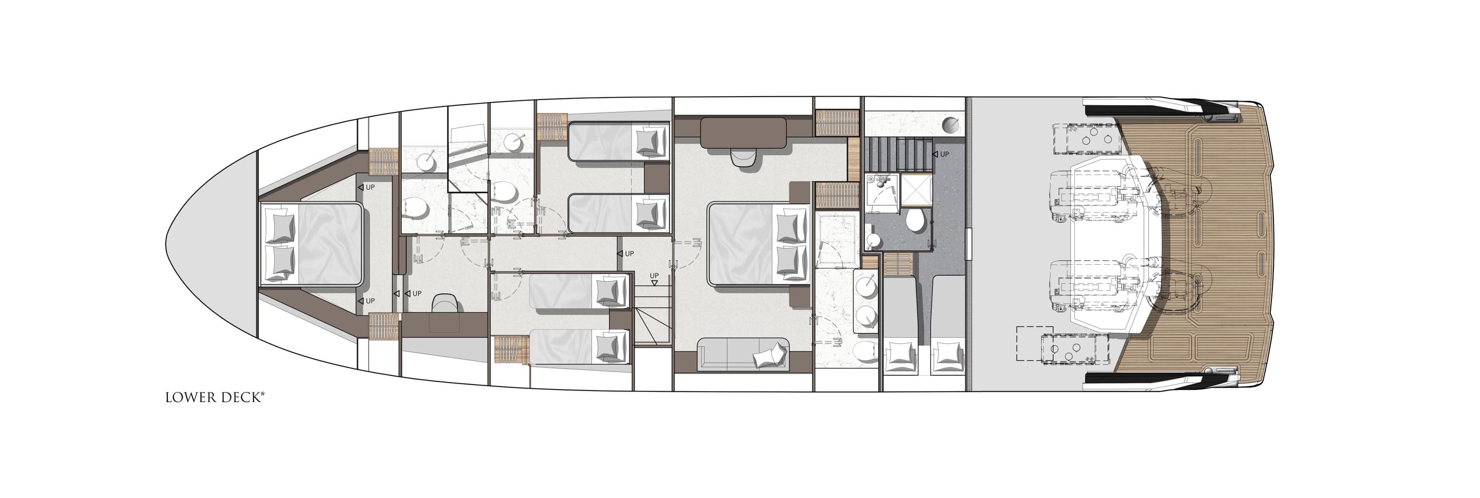 Below deck, the 74 Ocean reveals a full-beam master cabin complete with a private en-suite, offering a haven of tranquillity. Three further guest cabins, each with their own en-suite, ensure every detail of comfort is extended throughout. Dedicated crew accommodation for two, with discreet access from the side decks and direct entry to the engine room, preserves guest privacy on every voyage.