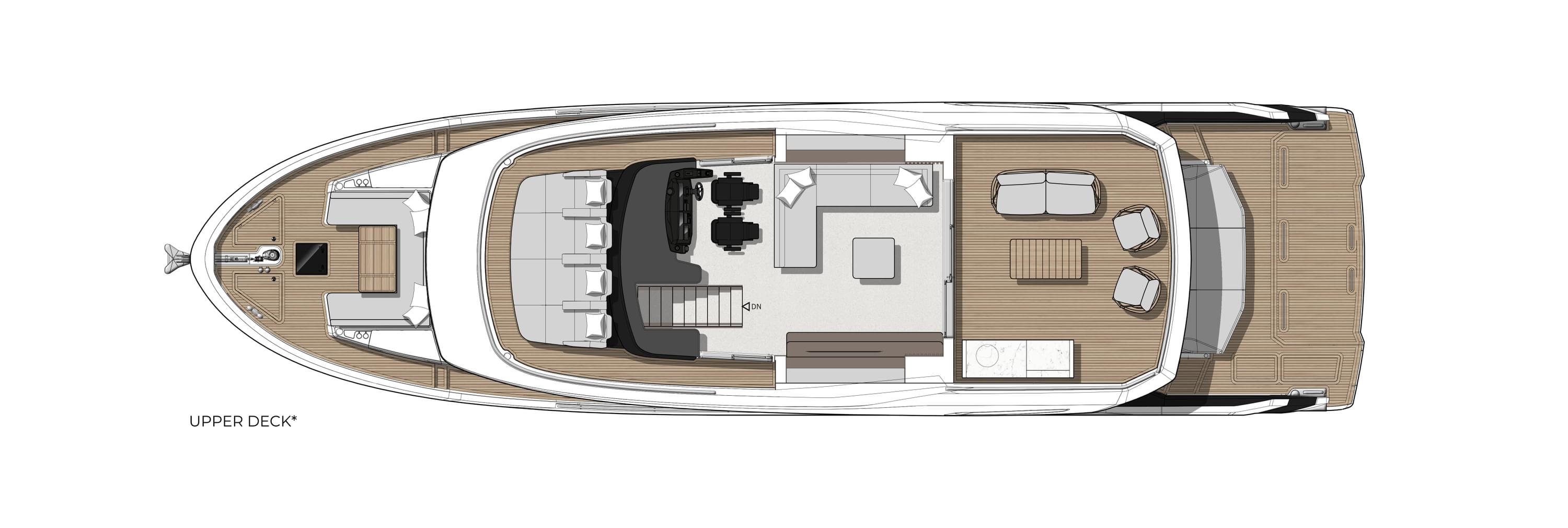 The enclosed raised pilothouse provides owners with an alternative social space separate from the main deck entertaining areas, while the optional glazed opening roof allows them to enjoy an open-air atmosphere and the thrill of the driving experience.